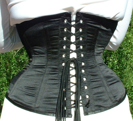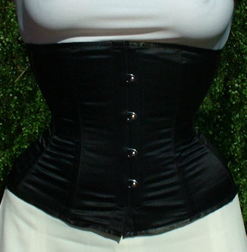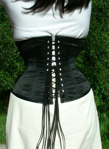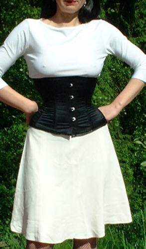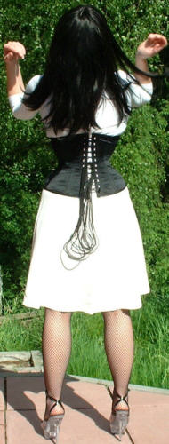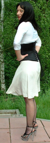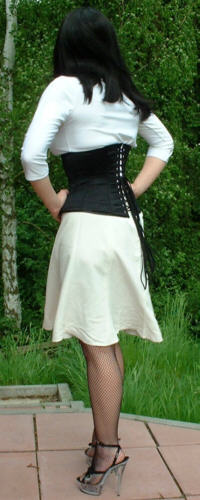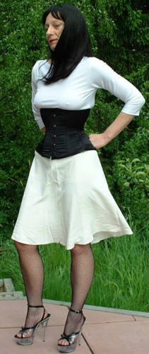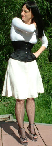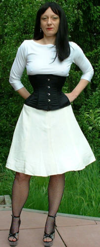 Bei dem Korsett handelt es sich um ein 410 von Revanche de la femme in schwarzem Satin, Schnürweite 56 cm, kombiniert mit einem Shirt und Rock in Weiß.