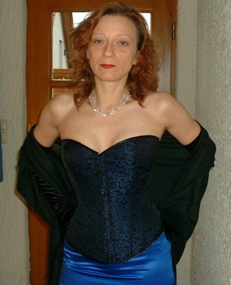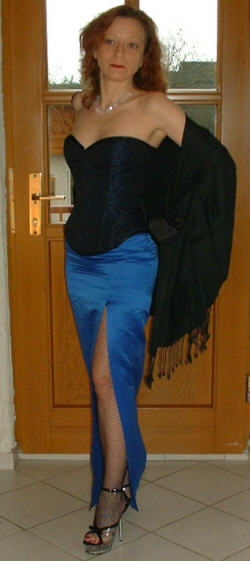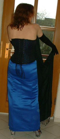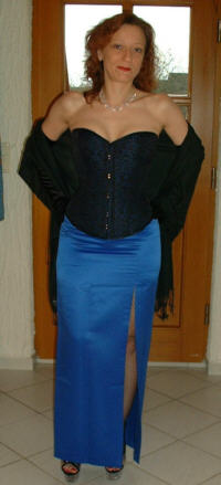 + Vollbrustkorsett 2053 von Revanche de la femme in Jacquard Fantasie blau + Bodenlanger Rock von Revanche de la femme aus royal-blauem Satin