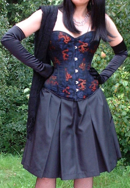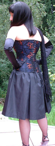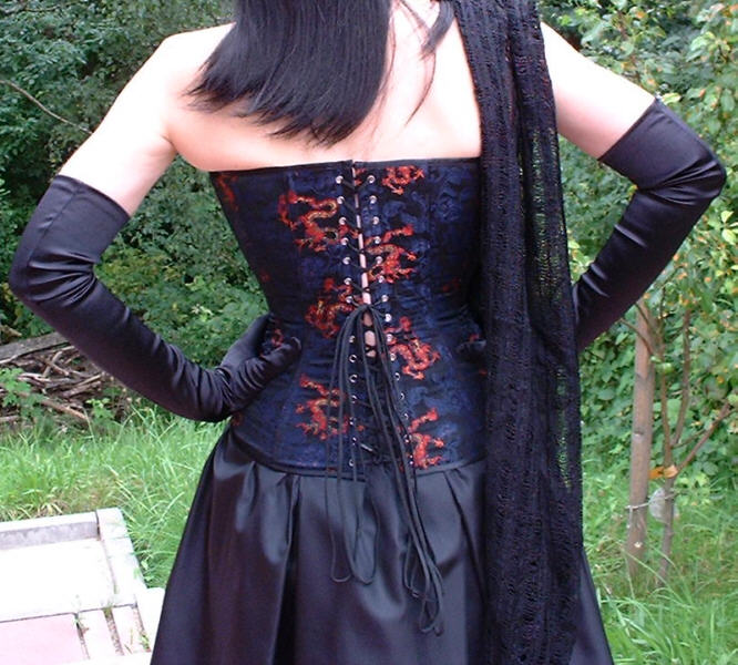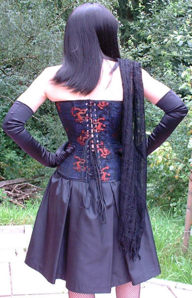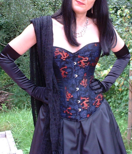 von Revanche de la femme in Jacquard Drache blau, Schnürweite 61 cm. Dieses Vollbrustkorsett in Jacquard Drache blau ist sehr attraktiv mit roten Drachen und blauen Blattornamenten auf schwarzem Grundstoff