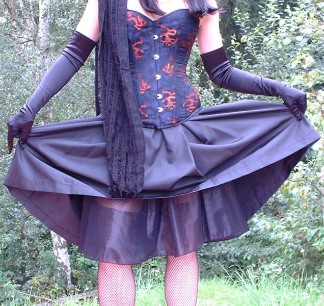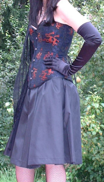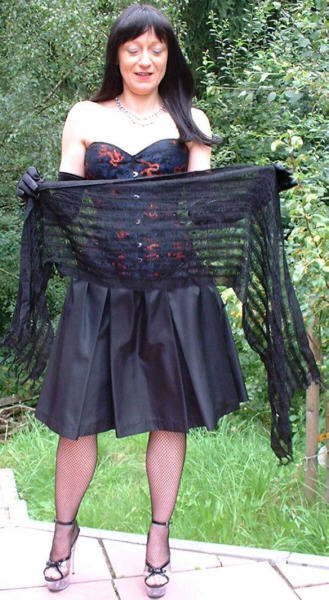 gemustert. + Eleganter, weit schwingender Rock von Murek, knielang, aus schwarzem Satin, mit 6 gelegten Falten, transparenter Unterrock. + Netzschal, schwarz, 150 cm x 35 cm.