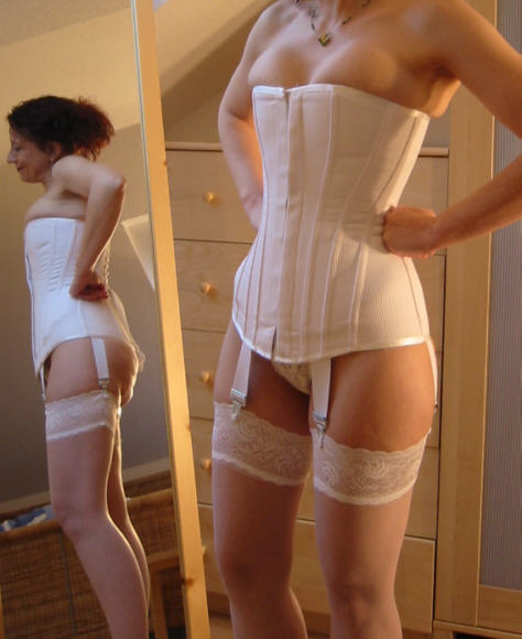 Bei dem Korsett handelt es sich um ein Vollers 1890U in white-stripe, Schnürweite 56 cm.