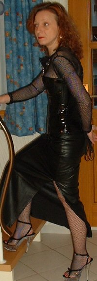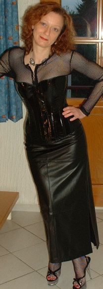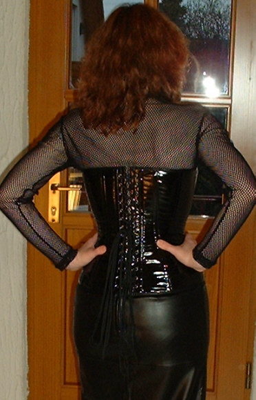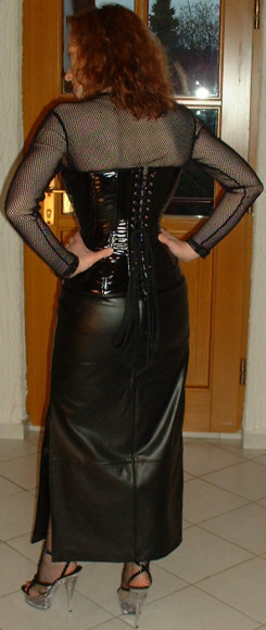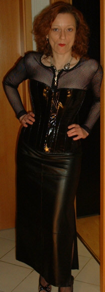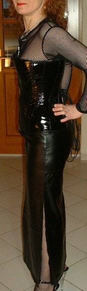 Bei dem Korsett handelt es sich um ein 2051 von Revanche de la femme in schwarzem Lack, Schnürweite 56 cm, kombiniert mit einem Netzshirt und einem langen Rock aus schwarzem Kunstleder.