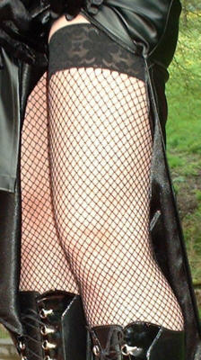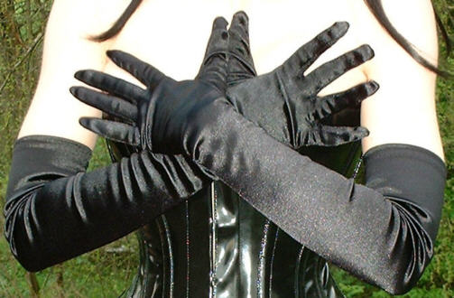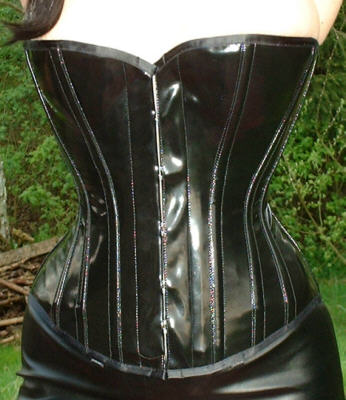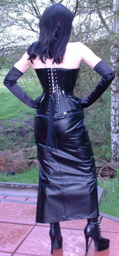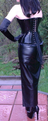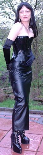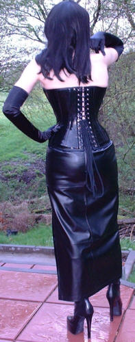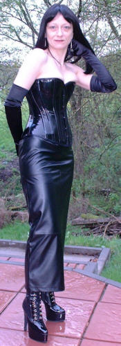 Bei dem Korsett handelt es sich um ein 1905U von Vollers in schwarzem Lack, Schnürweite 56 cm, kombiniert mit langen Abendhandschuhen, einem langen Rock aus schwarzem Kunstleder, Netzstrümpfen und hohen Schnürstiefeln.