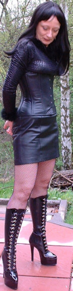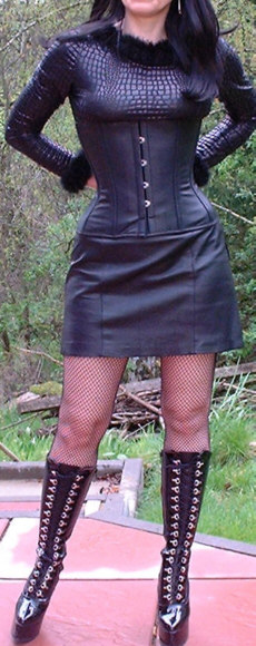 Bei dem Korsett handelt es sich um ein 4000U von Vollers in schwarzem Leder, Schnürweite 61 cm, kombiniert mit Sirt in Snake-Print-Design, einem kurzen Rock aus schwarzem Kunstleder, Netzstrümpfen und hohen Schnürstiefeln.